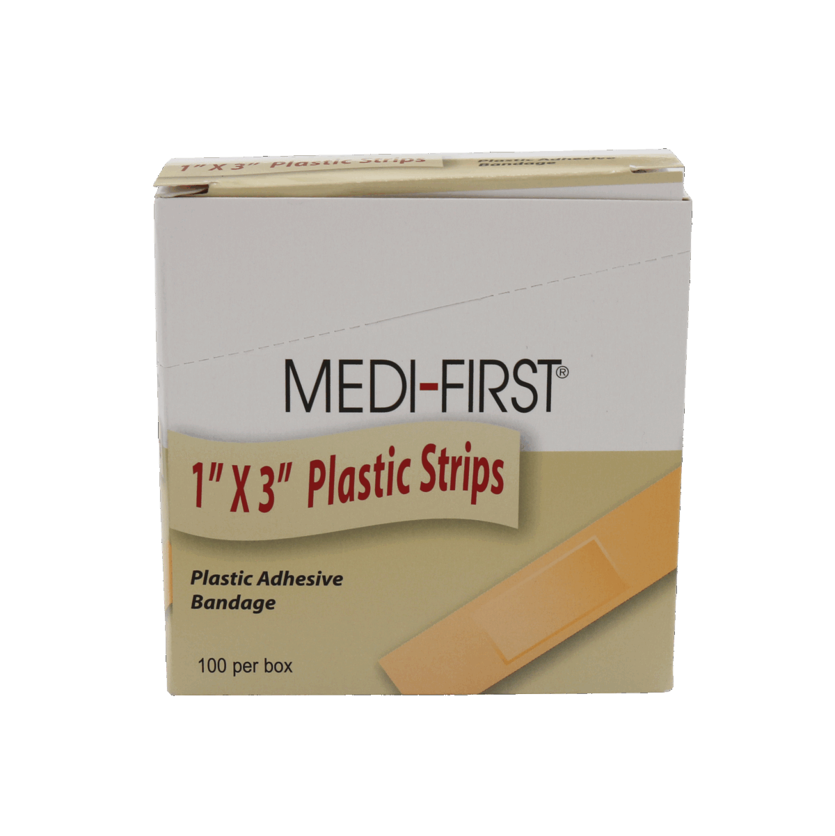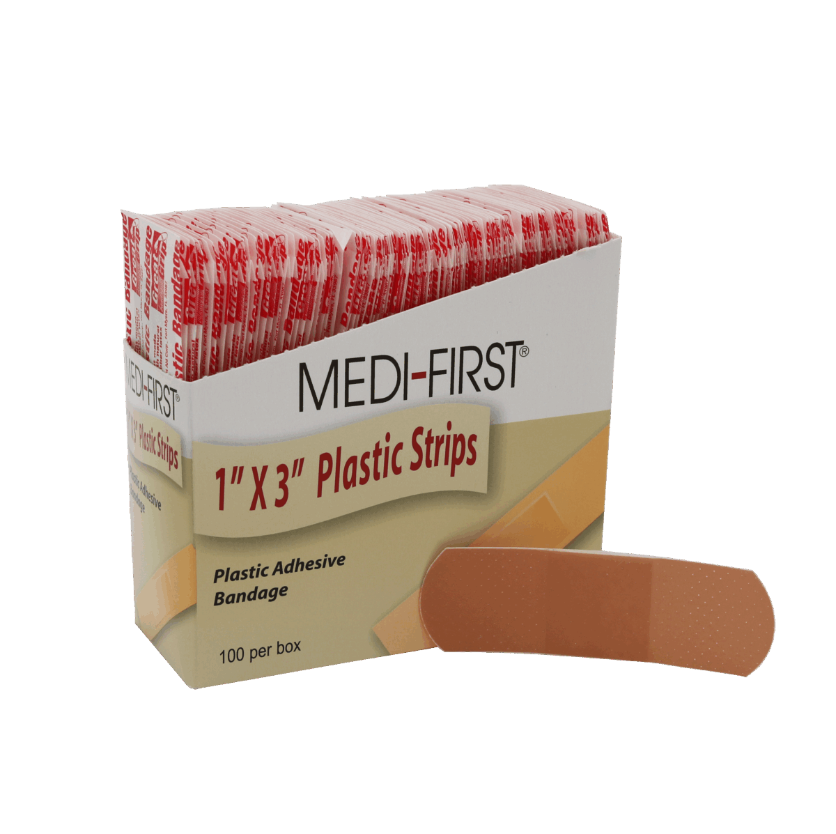 Packaged in a 100-count First Aid Kit dispenser box with a convenient tear-off top for easy access and first aid kit dispensing. Each Plastic Strips adhesive bandage measures 1-inch x 3-inch and is individually wrapped.