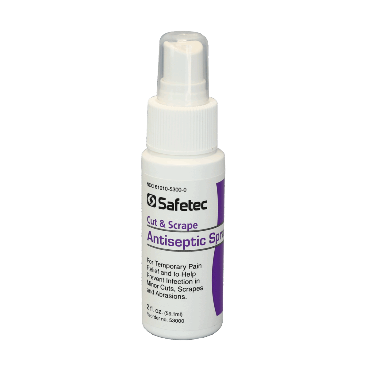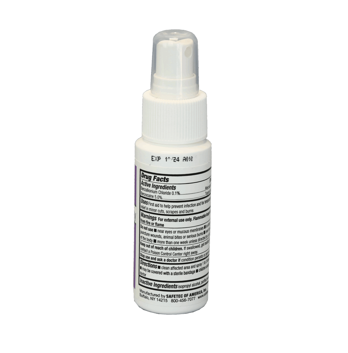 Safetec Antiseptic Spray in a 2oz pump spray bottle for cuts and scrapes. This first aid spray has a topical pain reliever.