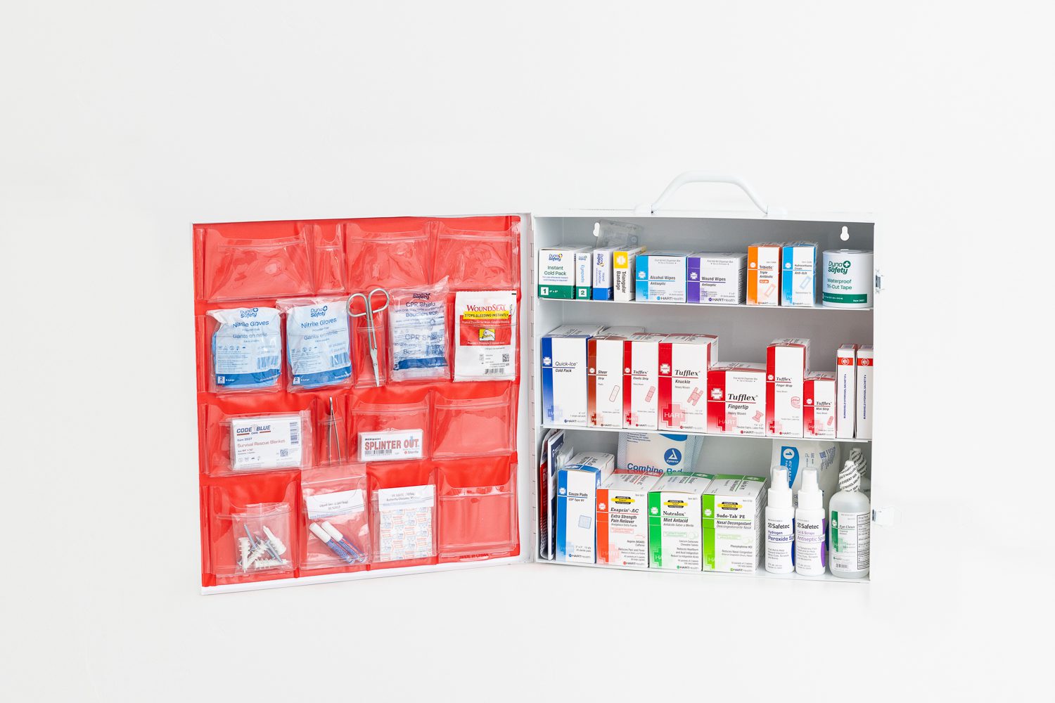 Our very own Medium Industrial First Aid Kit. This medium industrial kit is very popular because it contains enough quality first aid products to serve up to 75 people and allows self-service storage to meet the most demanding first aid supply needs.