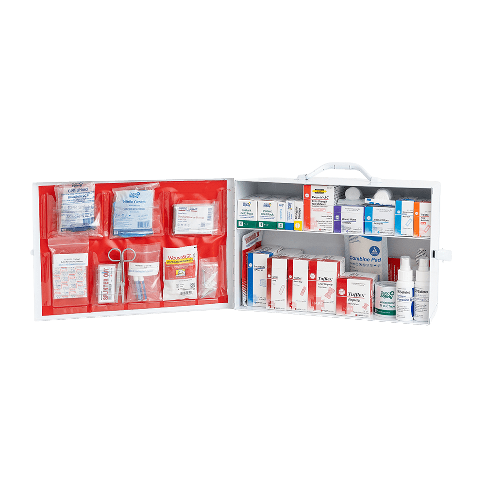 Our very own Small Industrial First Aid Kit 2-shelf, is a popular kit for smaller organizations and contains enough quality first aid products to serve up to 25 persons, and allows for ample self-service storage.