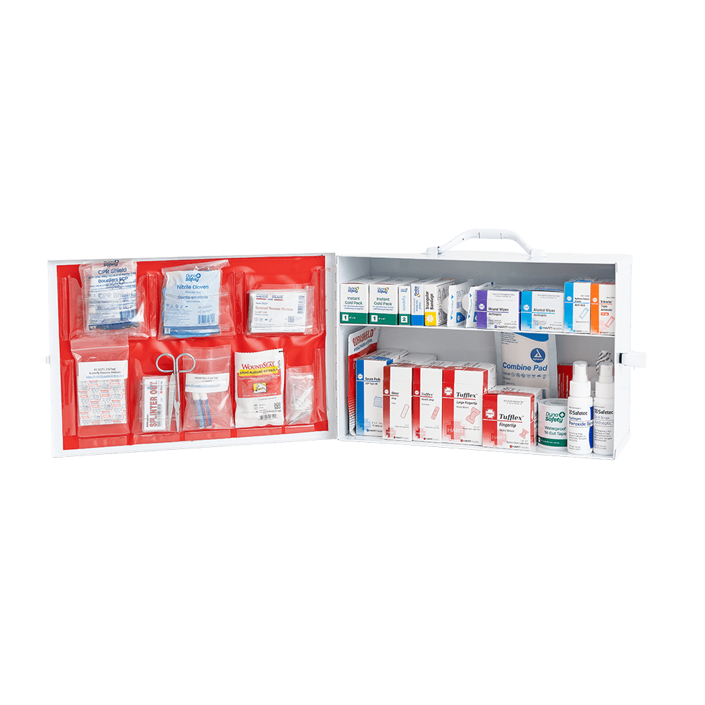 The Small Industrial Kit cabinet is made of durable steel with a quality baked enamel finish throughout, features a full-length door hinge, two latches, wall-mount slots, mounting hardware, door liner, first aid label, and carry handle. As with all our industrial kits, the quality first aid products inside are packaged in user-friendly dispenser boxes and individually wrapped and labeled to prevent misuse and cross-contamination.