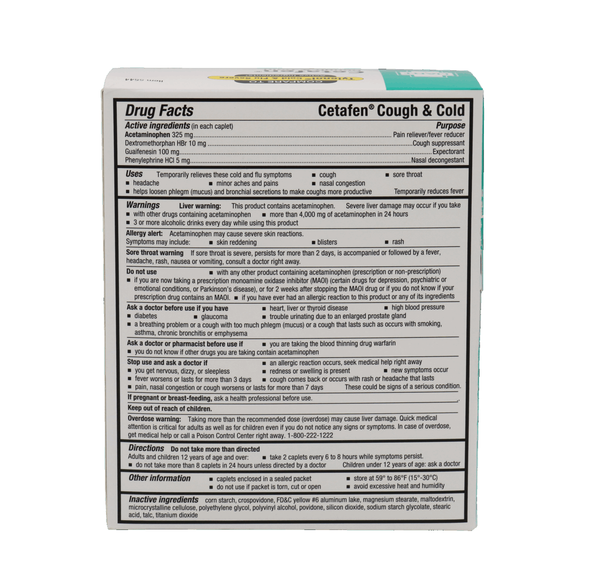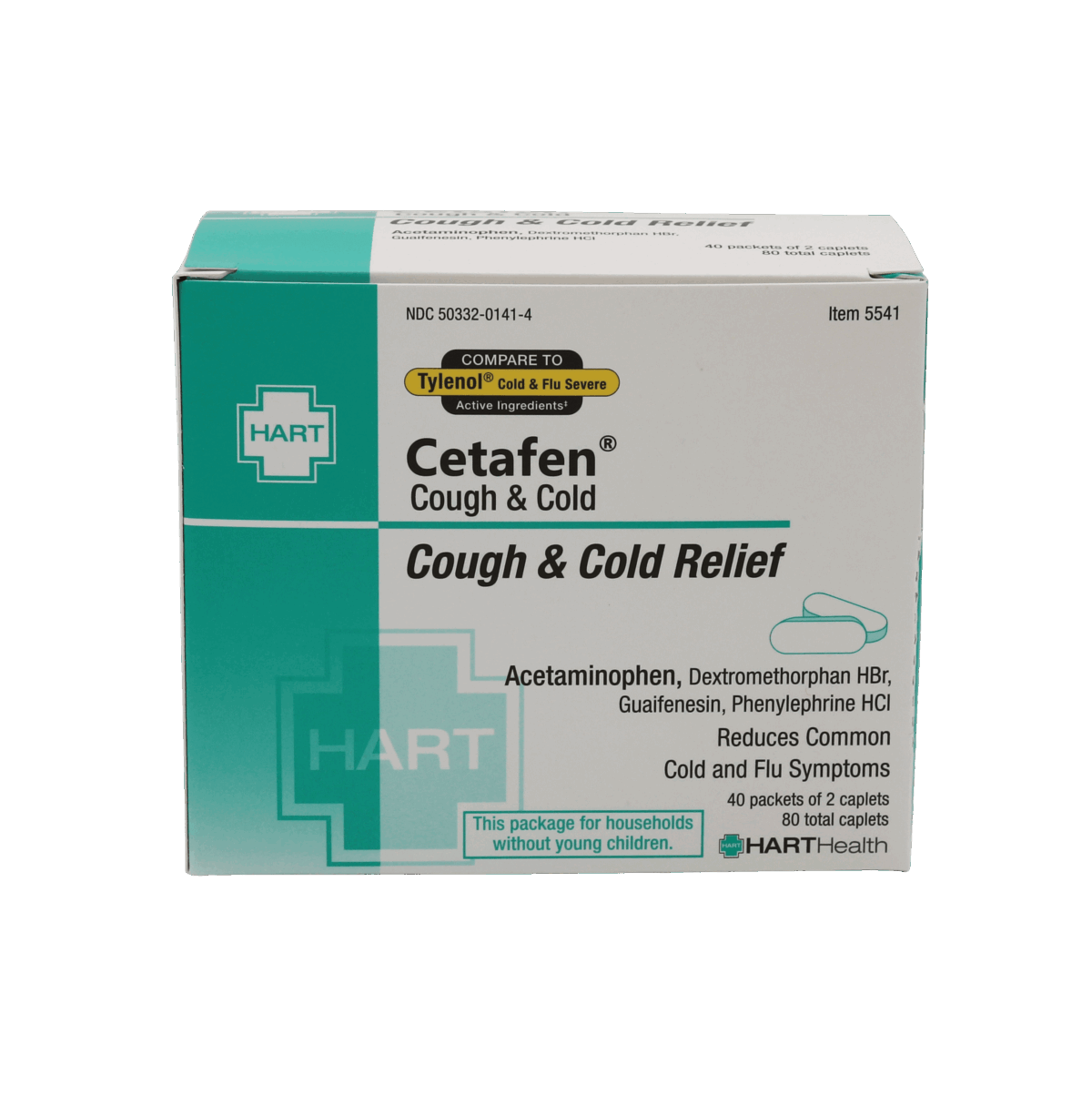 Cetafen Cough & Cold Relief from Hart Health. Packed in a workplace dispenser box, 2 caplets per package. This strong cough, cold and flu relief formula helps relieve multiple symptoms and has the same active ingredients as other name brands at a fraction of the cost. Cetafen cough & cold relief relieves cold and flu symptom such as fever, aches & pains, nasal congestion, cough and sore throat.