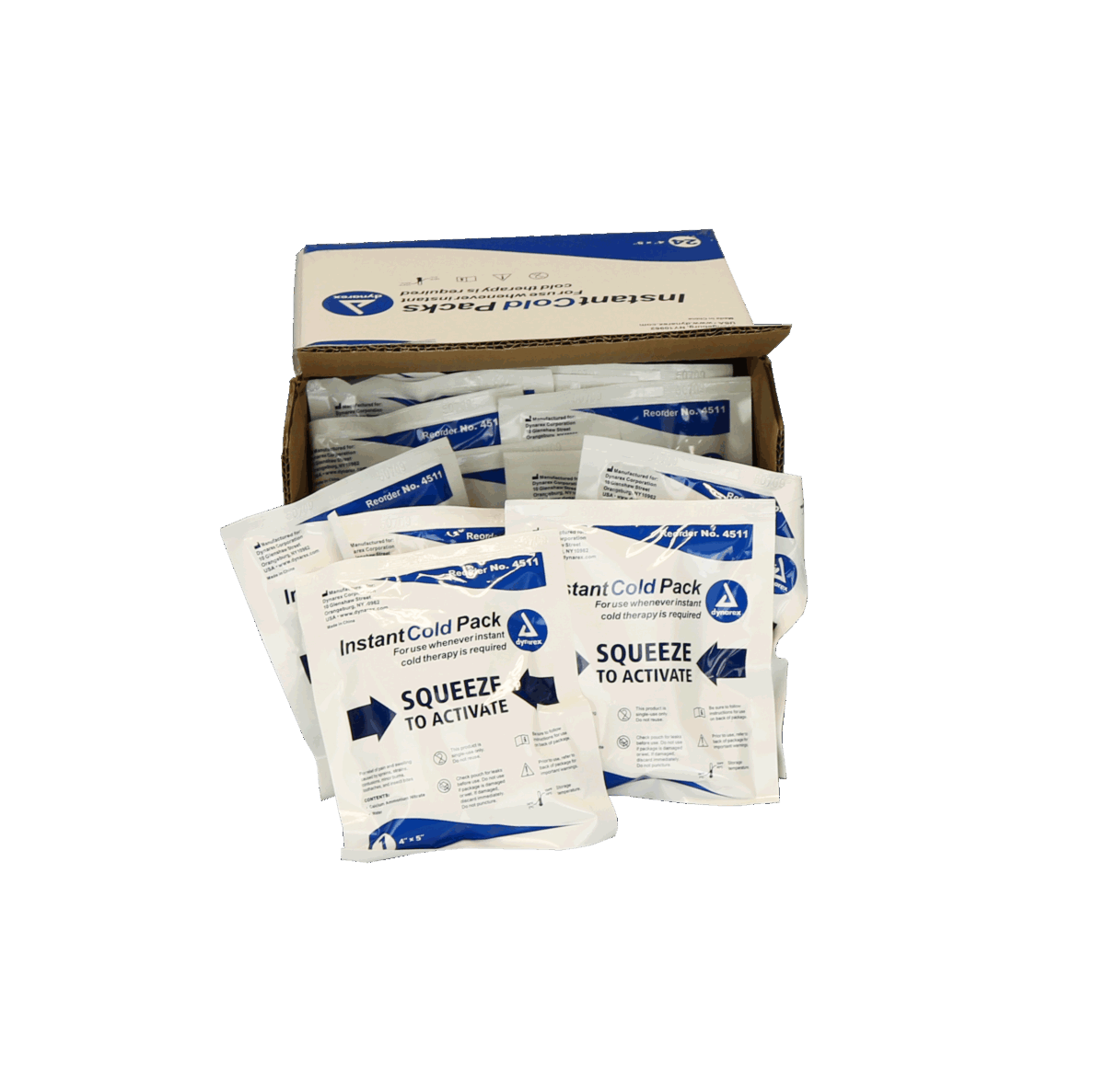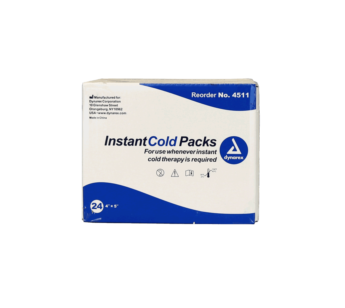 Dynarex Instant Cold Pack, small. 24/box. These single use ice/cold packs are easy to use and activate quickly with a simple squeeze. They provide cooling relief for everyday situations that call for first aid. Perfect for ANSI-compliant first aid kits, sports facilities and more!