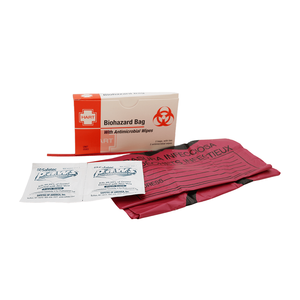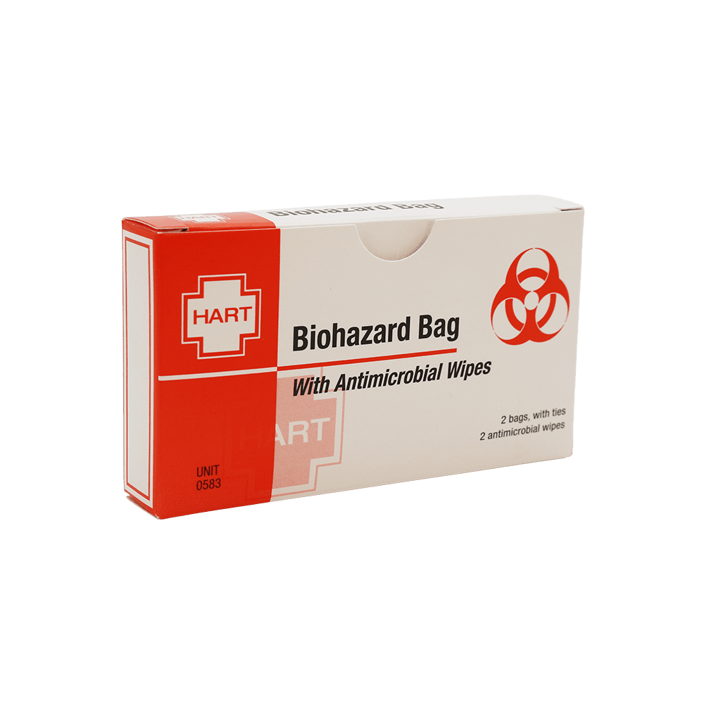Biohazard Bags in a unit box from Hart Health. Single width unit box comes with two red 7-to-10-gallon biohazard bags with ties, and two antimicrobial wipes. For use in workplace first aid kits. Unitized first aid products are color coded and individually sealed making items easy to identify and easier to inventory. Ideal for refilling portable and fleet vehicle first aid kits.