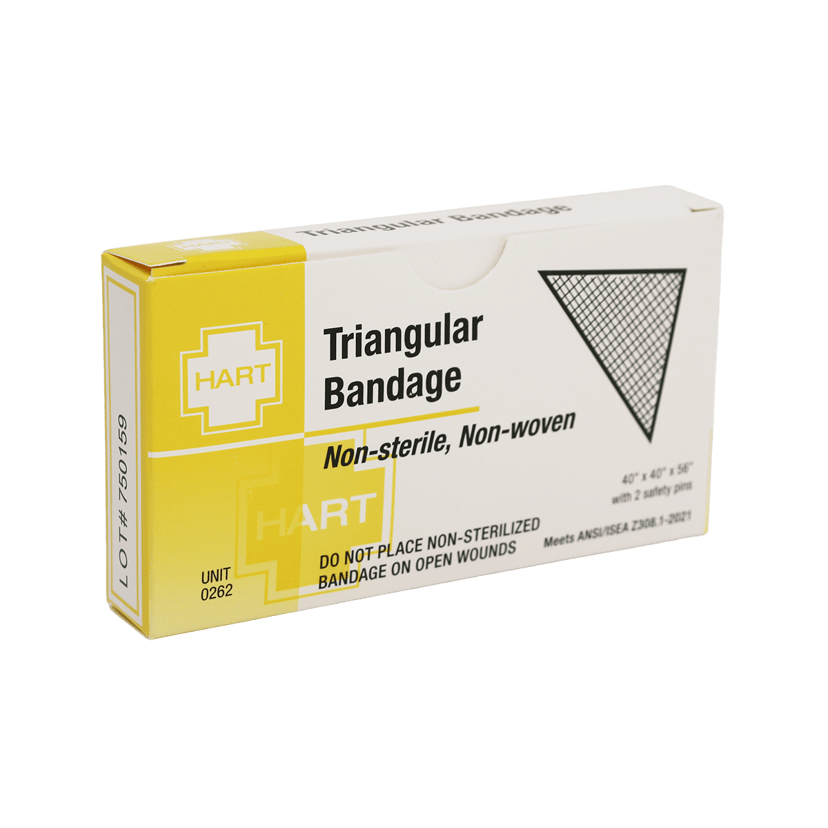 Non-sterile, triangular bandage unitized, with safety pins for first aid use. Also called a triangle bandage. One 40″ x 40″ x 54″ bandage in a one-and-one-half-width unit box. The back of the box has multiple illustrations of how to apply and use the triangle bandage. Meets the latest ANSI/ISEA Z308.1 standard. Unitized first aid products are color coded and individually sealed making items easy to identify and easier to inventory. Ideal for refilling portable and fleet vehicle first aid kits.