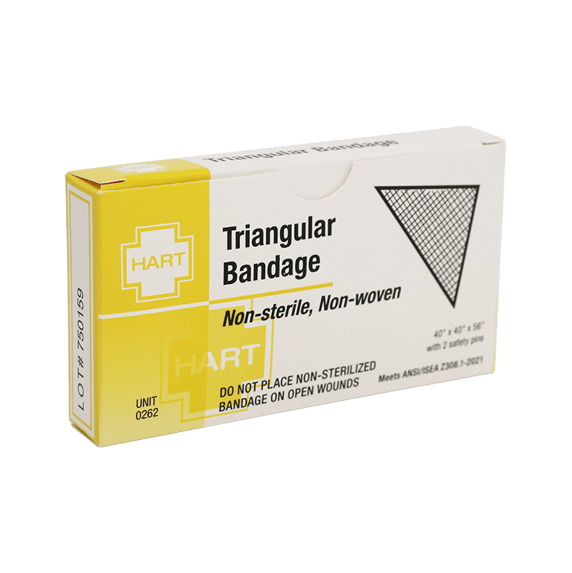 Non-sterile, triangular bandage unitized, with safety pins for first aid use. Also called a triangle bandage. One 40″ x 40″ x 54″ bandage in a one-and-one-half-width unit box. The back of the box has multiple illustrations of how to apply and use the triangle bandage. Meets the latest ANSI/ISEA Z308.1 standard. Unitized first aid products are color coded and individually sealed making items easy to identify and easier to inventory. Ideal for refilling portable and fleet vehicle first aid kits.