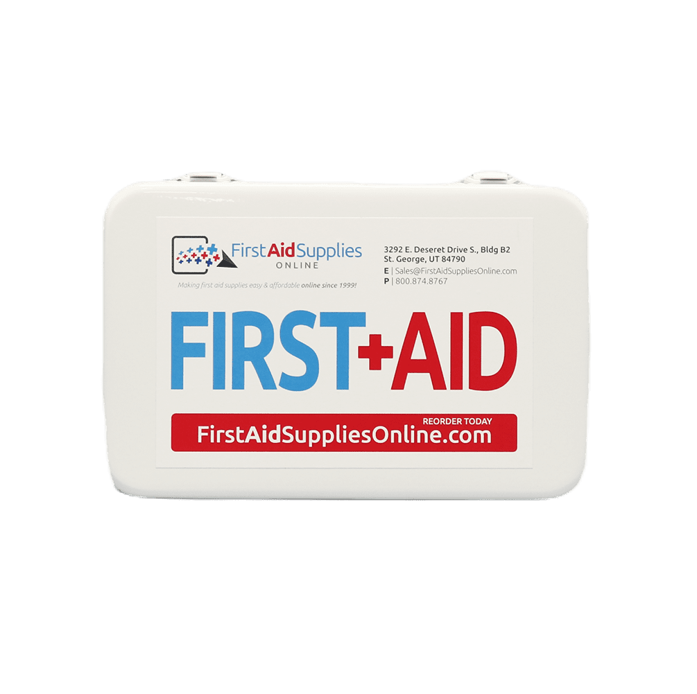 Ten Unit Metal First Aid Kit from First Aid Supplies Online. Packed in a rugged steel ten-unit kit box with double spring-loaded latches, neoprene seal, mounting brackets, First Aid label, and carry handle. This kit is ideal for small groups or individuals, 1-5 people.